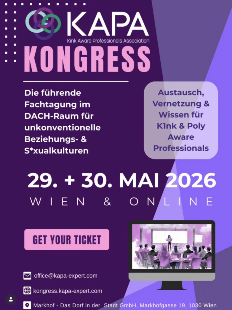 And above all, KAPs are not just a passive list but actively engage in education. Classically via social media and, at the end of May 2026, also with the first congress of its kind in Vienna. For two days, on May 29 and 30, 2026, experts will dive deep at the Markhof venue and online. Topics range from kink shaming in clinical practice and altered states of consciousness to anorectal injuries, kink in pregnancy, parasocial relationships, and the role of artificial intelligence. You can find the full program and tickets here.
