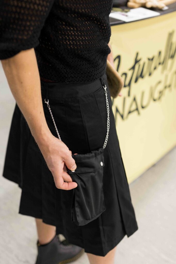 Die Schnitte von Herrenröcken sind gemeinhin härter und weniger verspielt. Nieten, Schnallen und Gürtel sind oft durch die Gothic-Szene beeinflusst. Unser knielanges Test-Modell hat einen Kilt-Touch: der Webstoff des Rocks liegt oben eng an und springt dann in vielen Falten auf. Er lässt sich kinderleicht anziehen und wird dann mit Druckknopfverschluss am Bund und einem Reißverschluss geschlossen. Die Klappentasche ist mit einer Karabinerkette abnehmbar und hat genügend Platz für ein Telefon, eine Geldbörse und auch noch eine Packung Taschentücher.
