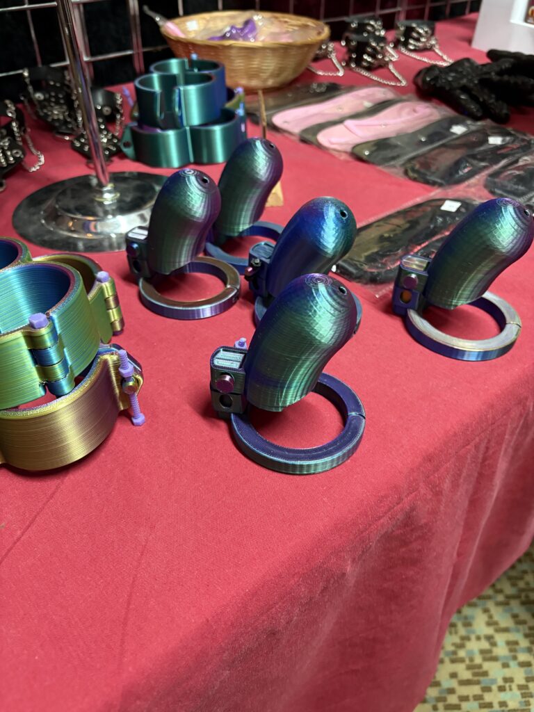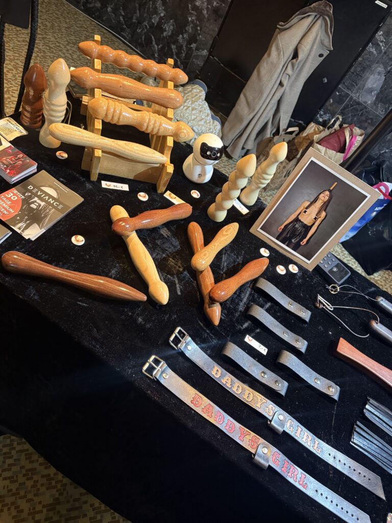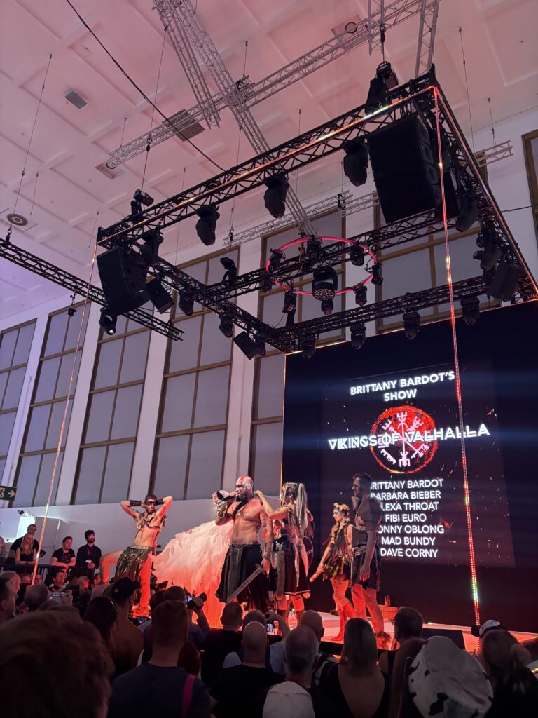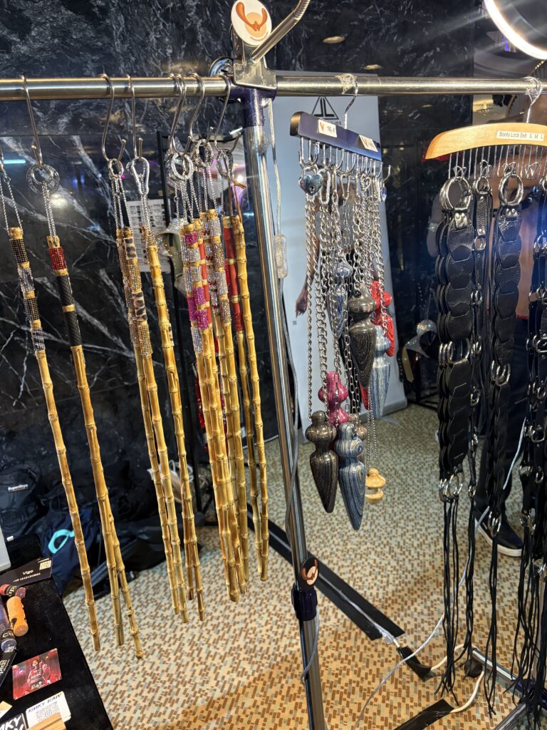 Natürlich haben wir auf der „Kinky Venus“, so der Name der Halle, zunächst die üblichen Verdächtigen getroffen. Weppy war mit dabei und hat neben den bekannten hochwertigen Holzdildos funkelnde Neuigkeiten präsentiert, darunter glitzernde Rohrstöcke, die sofort ins Auge gefallen sind. Auch zahlreiche Dominas waren präsent, dazu Fashion-Marken wie Subused und Lisa Majun, die die Messe mit glänzenden und glamourösen Outfits gefüllt haben. Auf der Bühne lief ein abwechslungsreiches Showprogramm, das von Peitschen-Demonstrationen über Fashion-Show bis hin zu Performance-Art reichte.